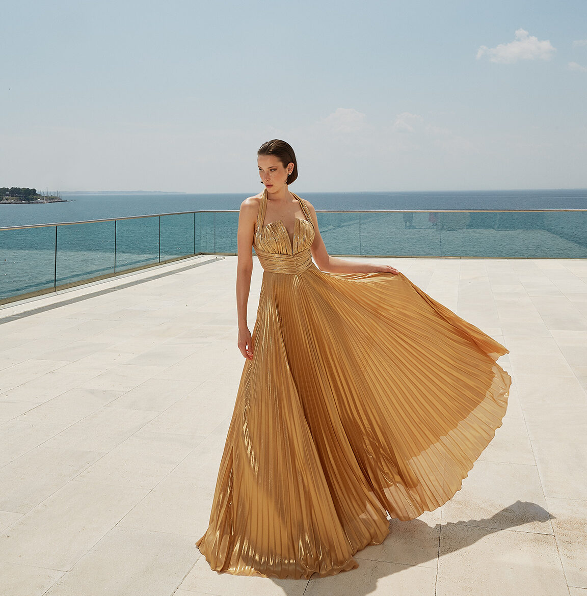 Abito lungo da Cerimonia, in tessuto dorato, corpetto drappeggiato e gonna plissettata