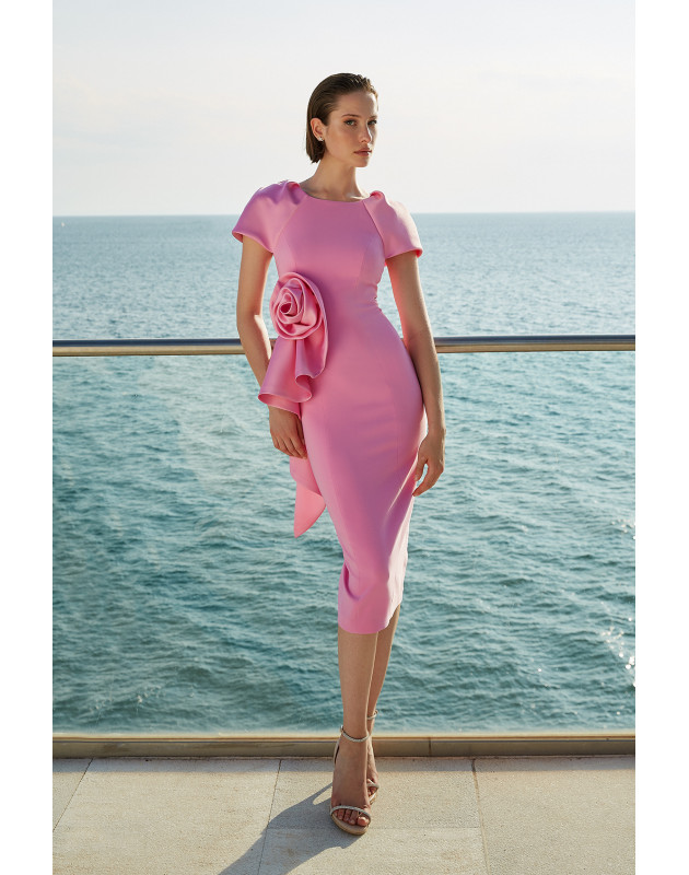 Abito midi maniche corte, con rosa laterale.
