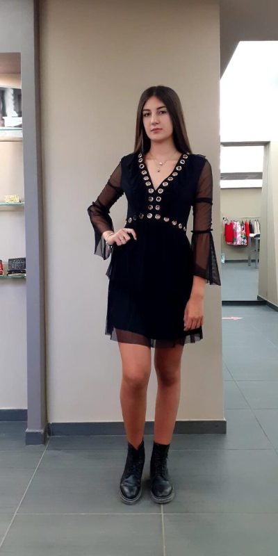 Abito corto a tubino, manica 3/4 con volants, scollatura a V, trasparenza spalle parte manica e punto vita. Lunghezza al ginocchio. 100% PL