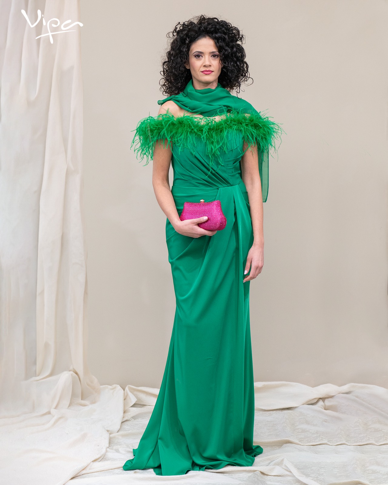 Abito lungo semi-sirena, scollatura omerale impreziosita da piume