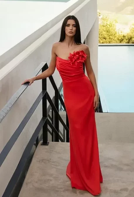 Abito lungo col. Corallo, corpetto drappeggiato con fiore applicato, linea semisirena