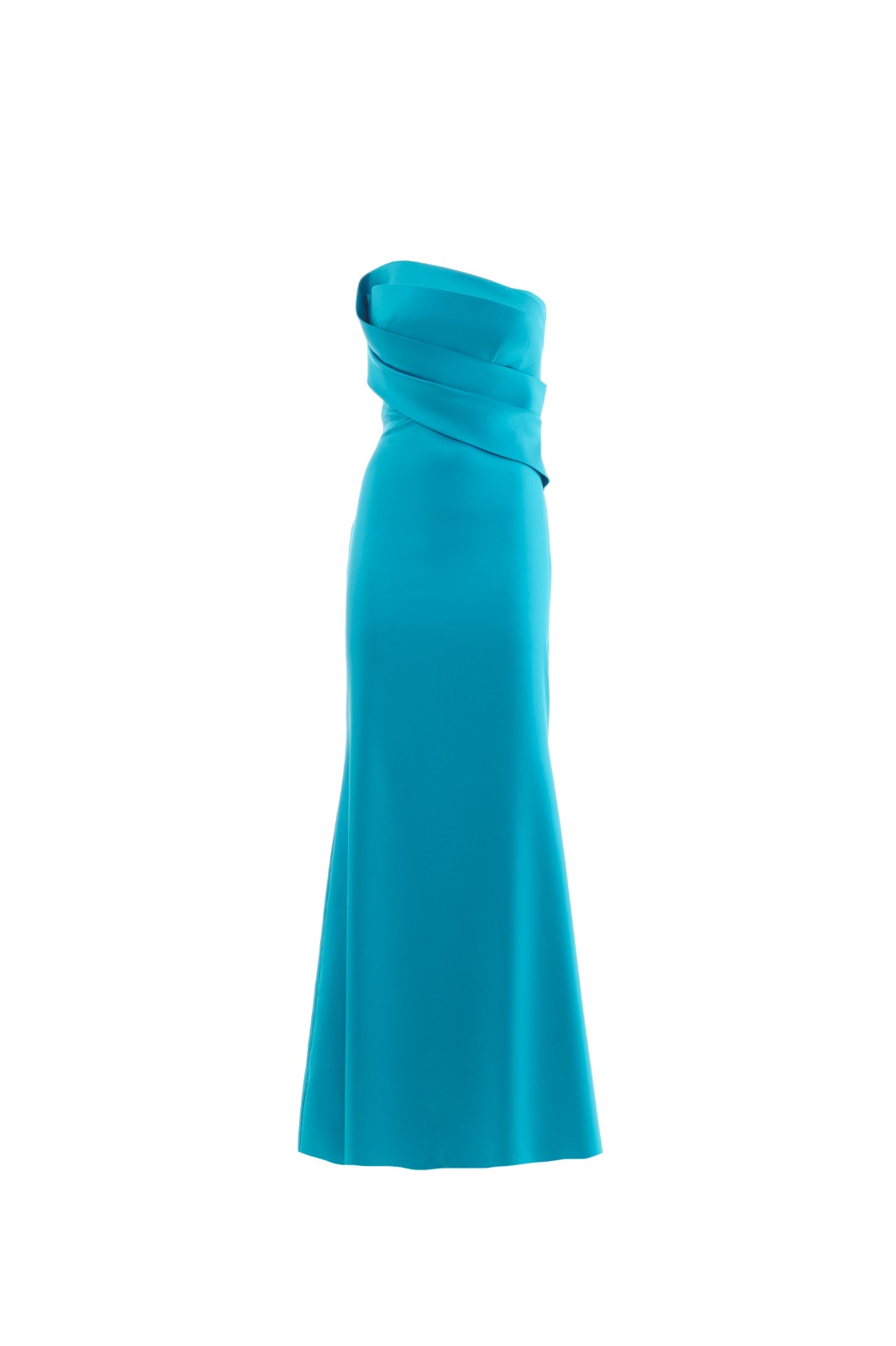 Abito lungo a sirena in raso con scollo asimmetrico e drappeggi lungo il busto