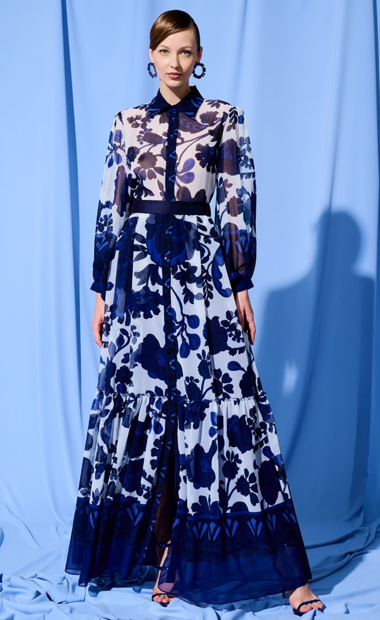 Abito lungo in georgette fantasia, stile chemisier, con manica lunga e collo a camica.