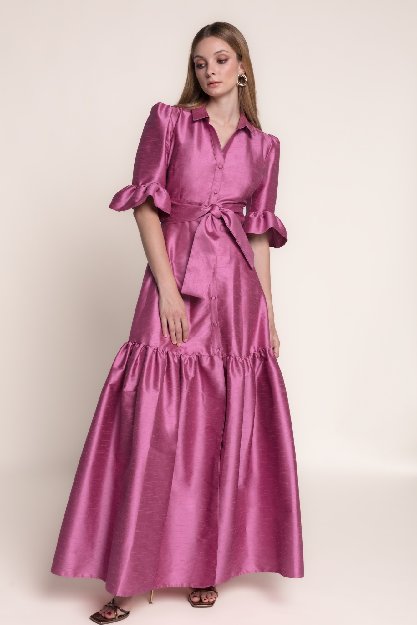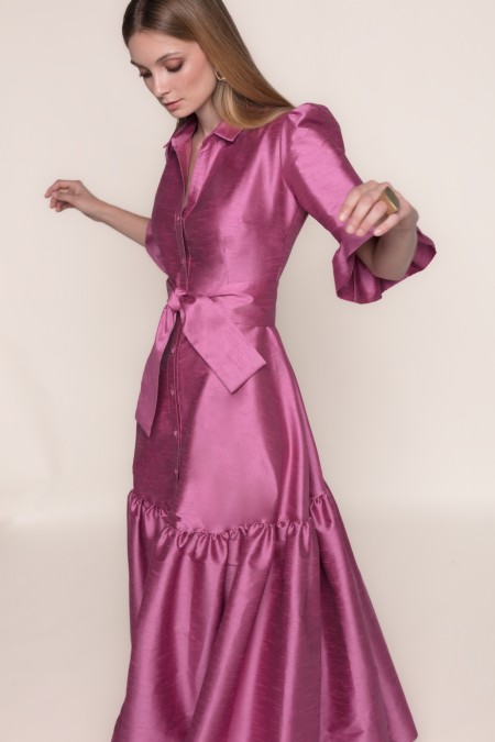 L’abito chemisier, in colore fucsia, è un capo sofisticato e versatile che unisce la freschezza della camicia tagliata con l’eleganza di un’ampia gonna . Realizzato in un tessuto satinato, che fornisce lucentezza e raffinatezza, si distingue per le maniche con volants