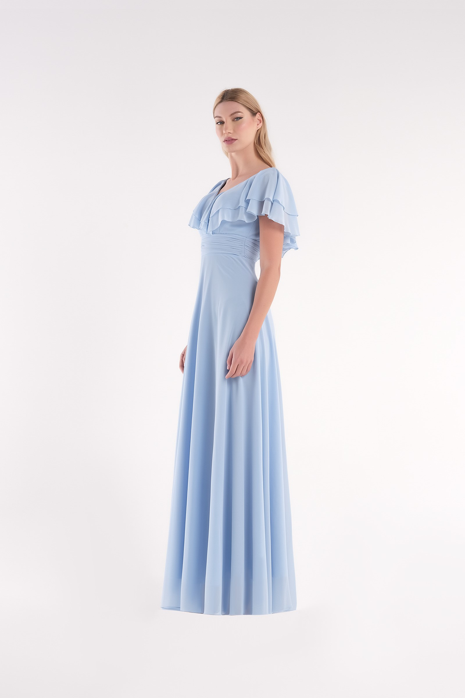 Doppio volant intorno a tutta la scollatura, fascione in vita con tessuto arricciato.