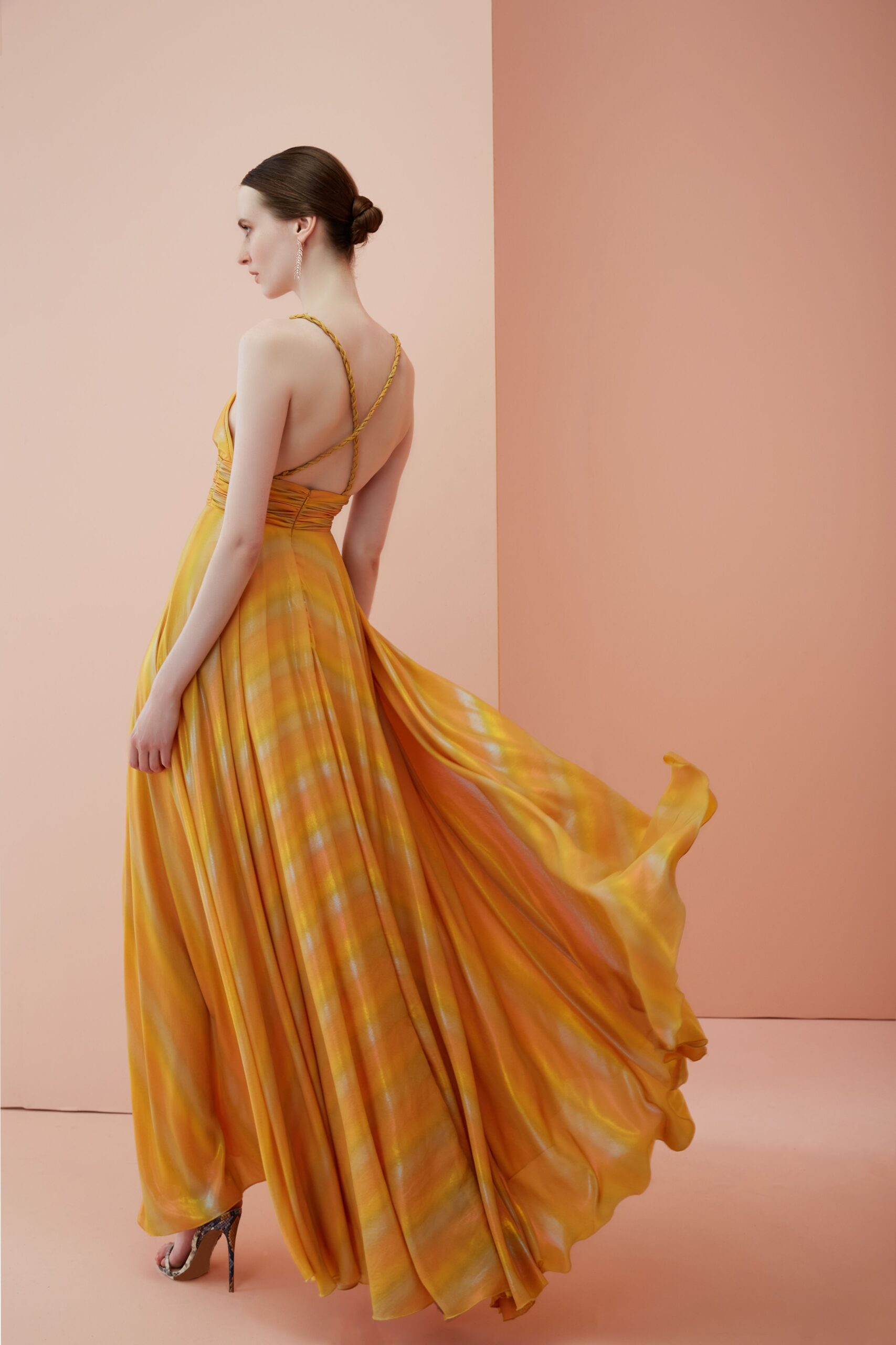 Abito lungo laminato, effetto oro, sfumato sulle tonalita del giallo/orange. Corpetto e fascia vita drappeggiati. Scollatura spalle con bretelline intrecciate che si incrociano.