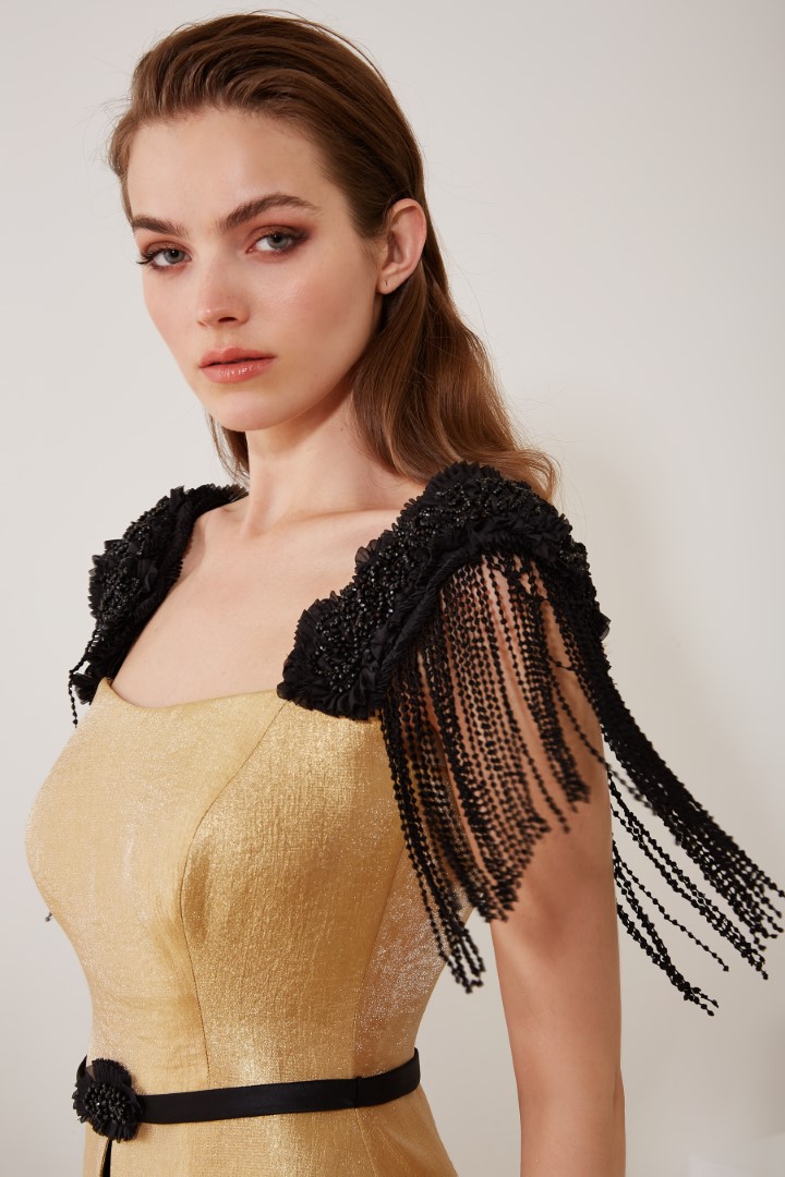 Corpetto col. oro con applicazioni in nero sulle spalle e frange, con spaccetto avanti e retro.