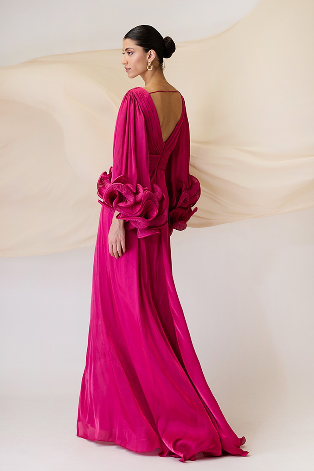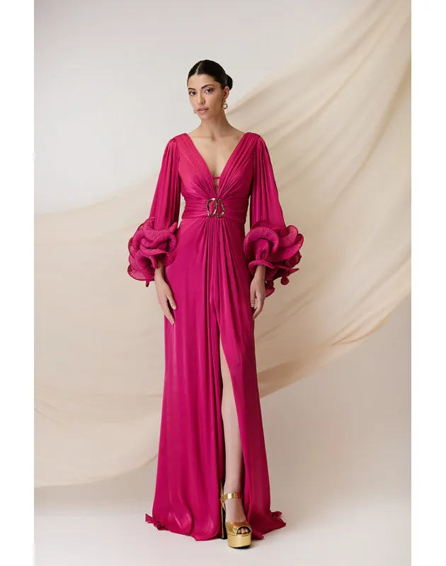 Abito lungo col. Bouganville, maniche lunghe con rouches sul fondo, Scollo a V,