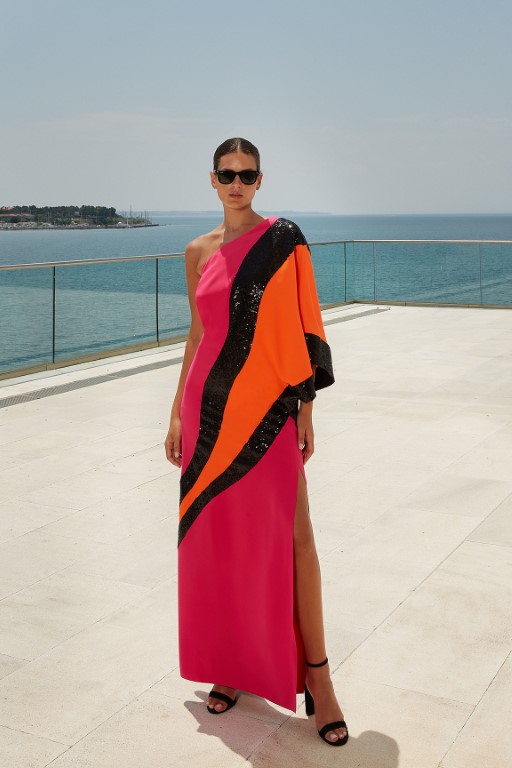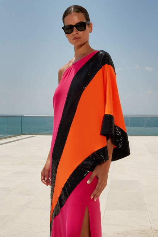 Abito multicolor lungo monospalla con decorazione in paillettes nere, con spacco