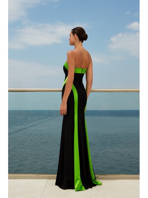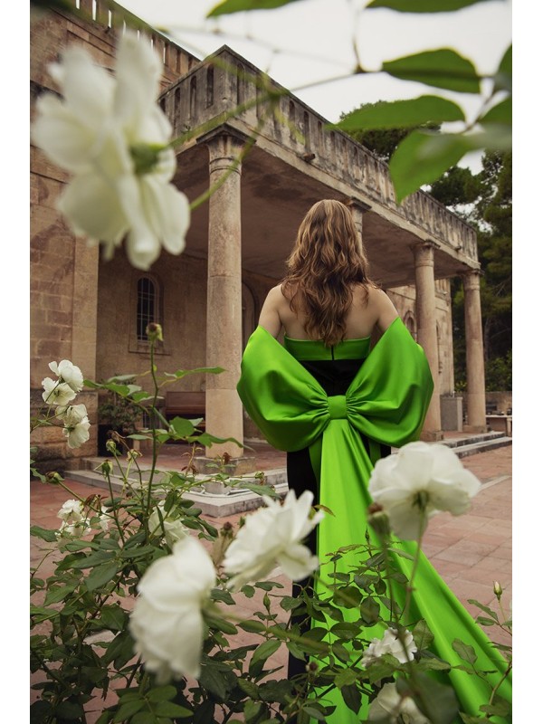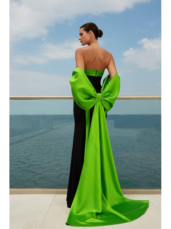 Set Abito lungo nero con bande laterali col. lime, linea sinuosa, scollatura omerale e bretelle in dotazione. Corredato da coprispalle, molto singolare, a forma di grande fiocco, in raso col. Lime