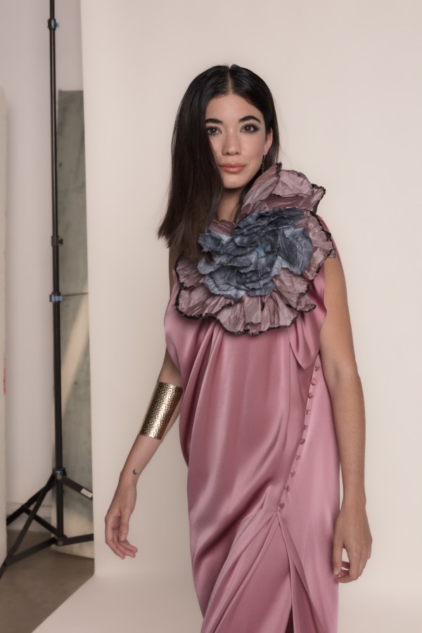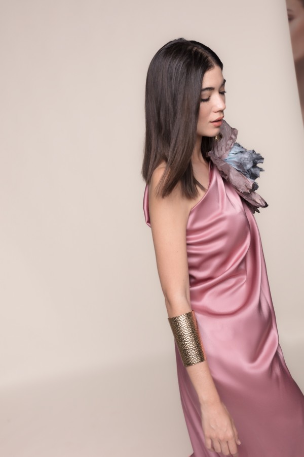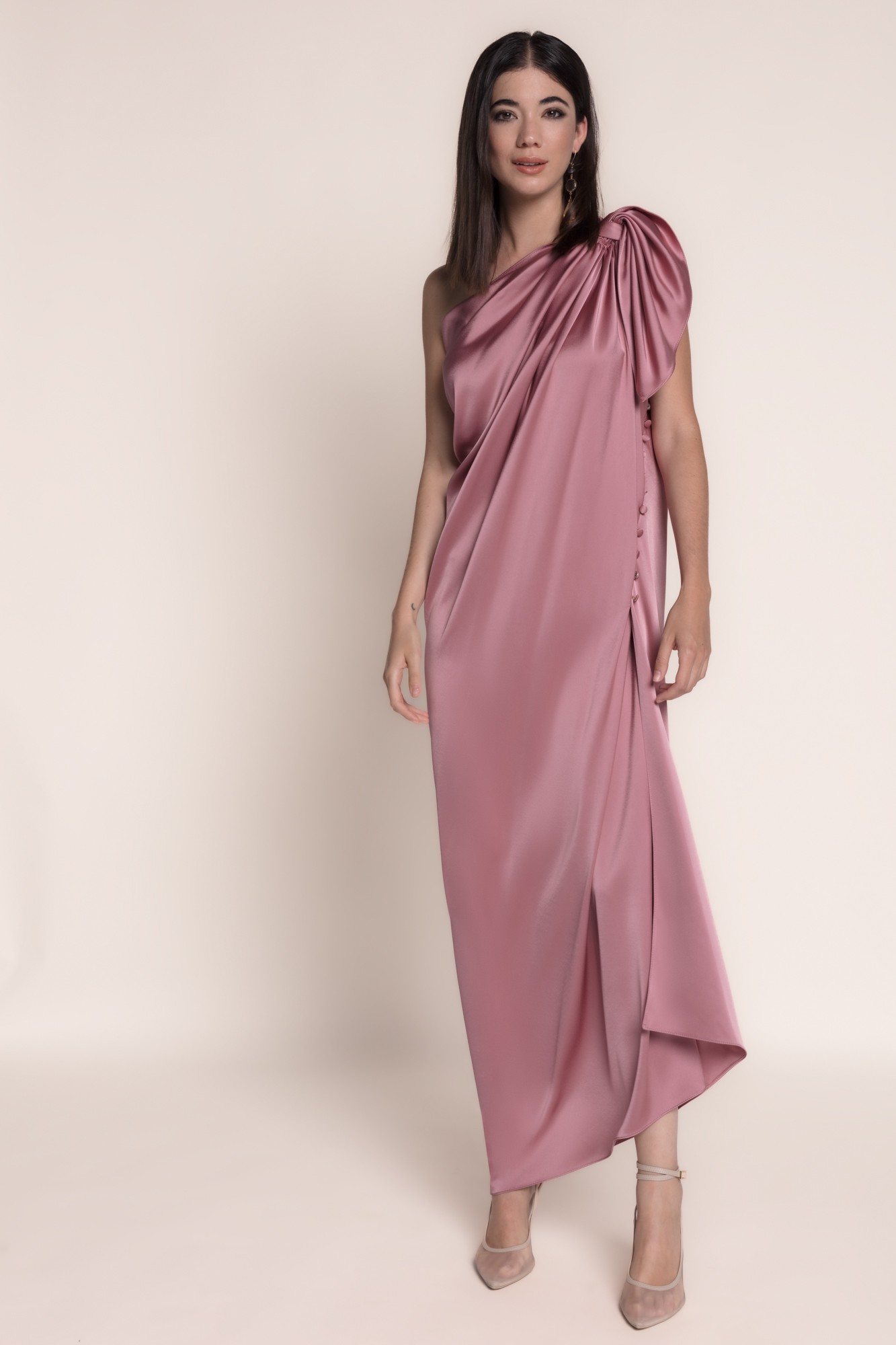Abito lungo in raso asimmetrico in rosa in polvere, un capo che unisce raffinatezza e modernità in un unico design. Il suo taglio monospalla con drappeggio porta un’aria greca e scultorea, ideale per le donne che cercano un’eleganza senza tempo con un tocco distintivo.