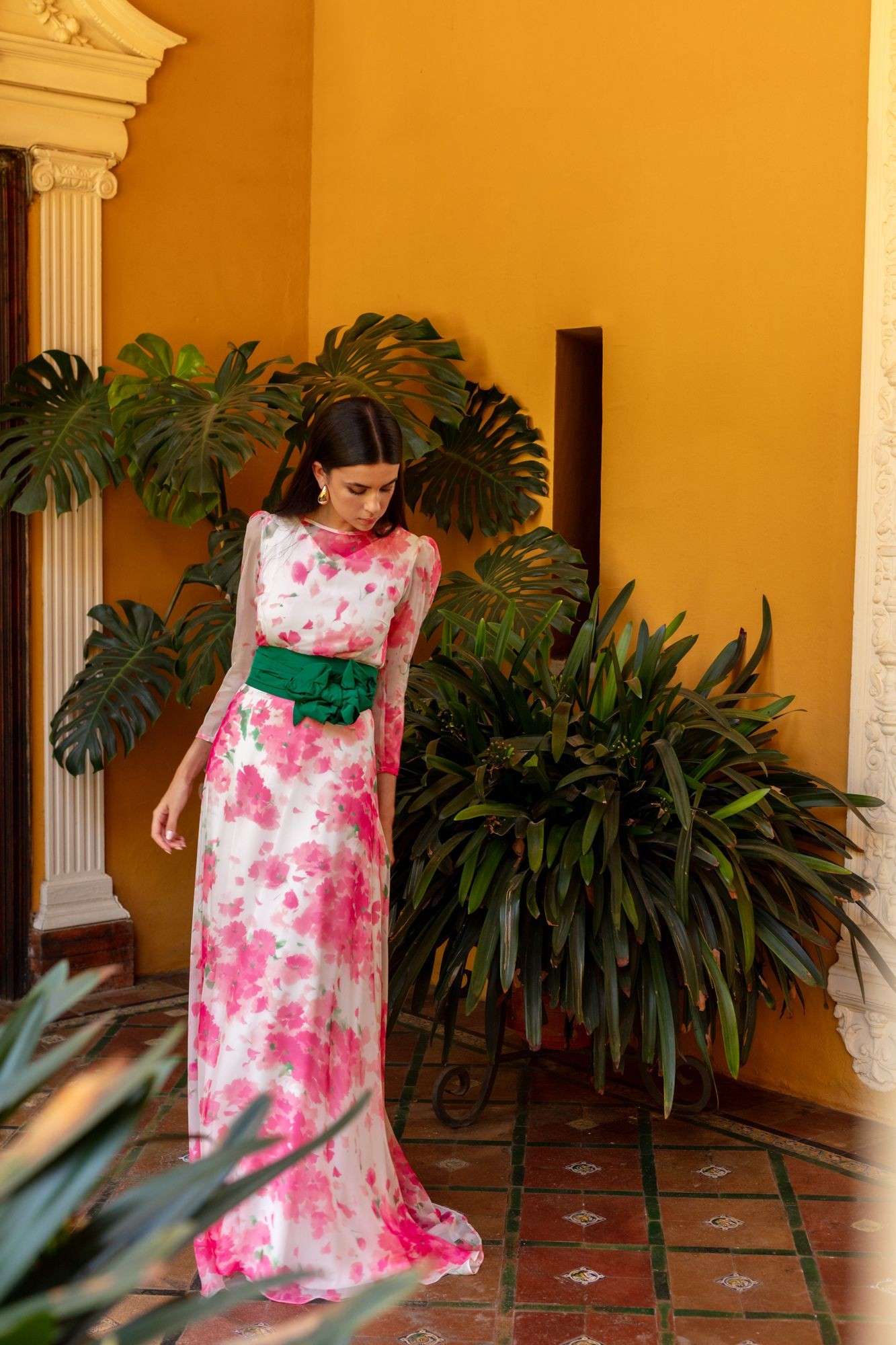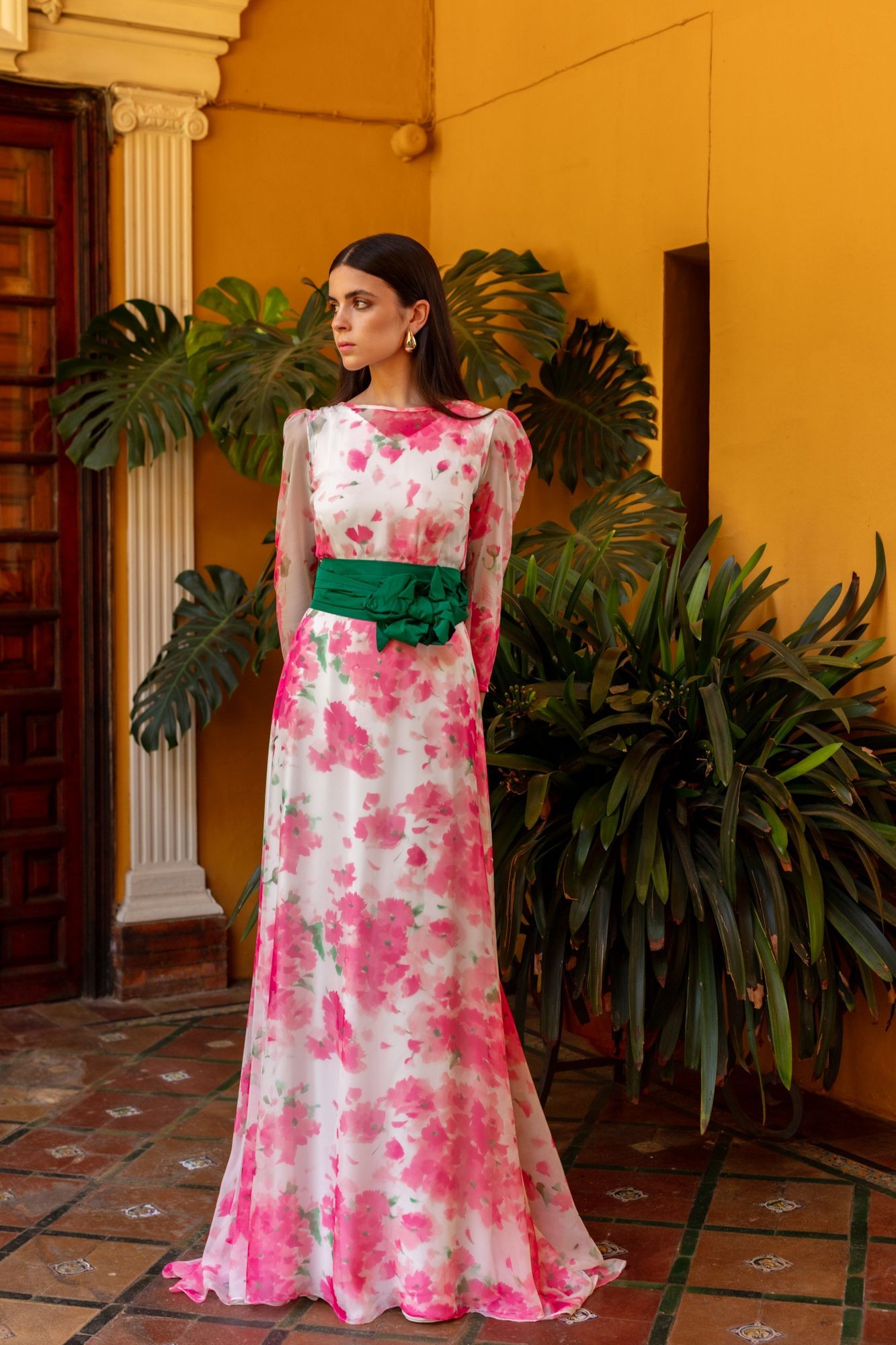 Questo lungo abito a garza con stampa floreale è ideale per matrimoni diurni, eventi speciali o celebrazioni all’aperto. Il suo delicato tessuto vaporoso a base bianca con fiori acquerellati in toni rosa crea un effetto sofisticato.