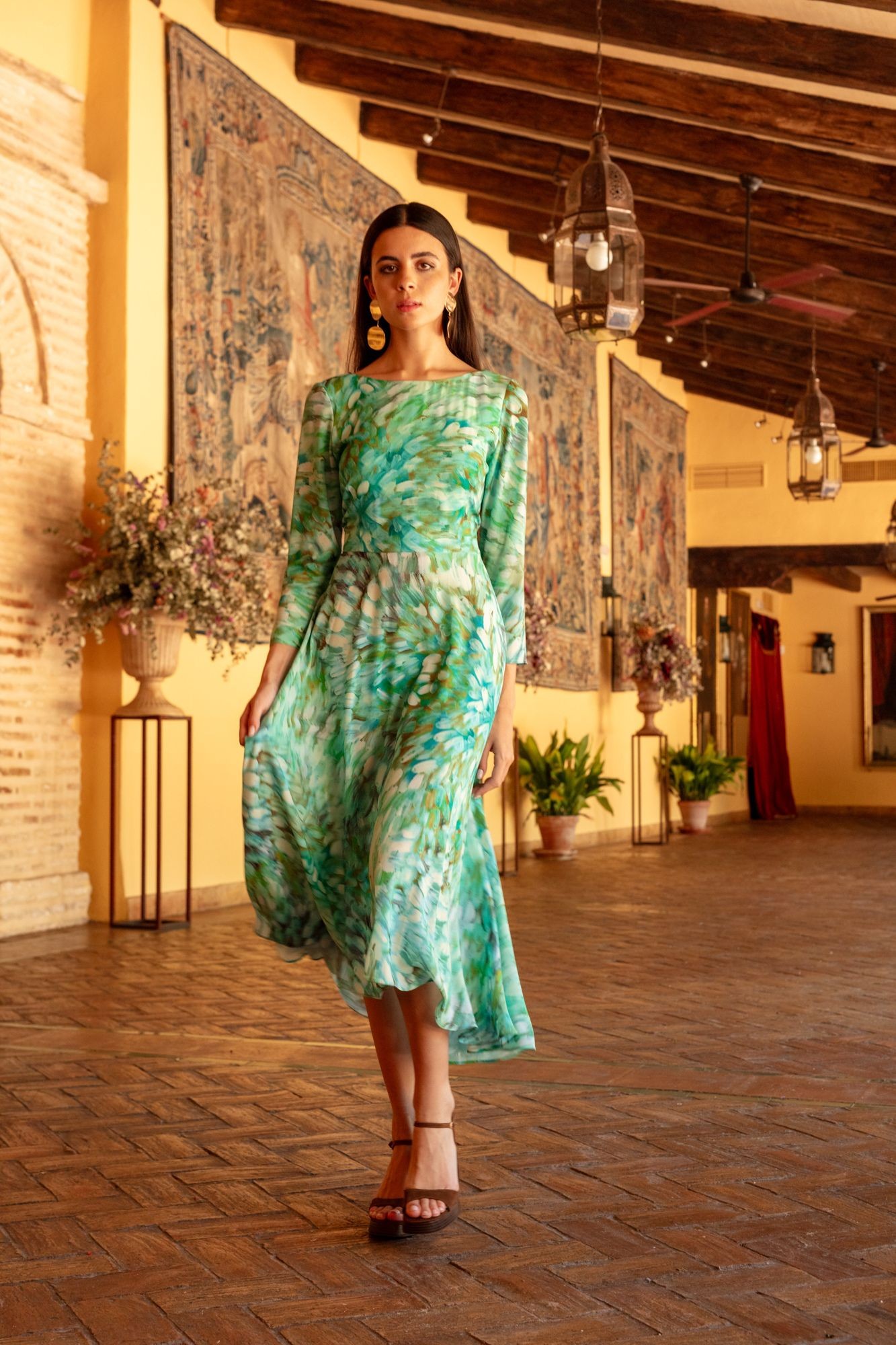 Un abito in tonalità verdi ad acquerello con ispirazione in natura. Realizzato in garza con fodera interna, questo design presenta una silhouette femminile con scollo chiuso, maniche lunghe e gonna con caduta che crea un movimento unico. La sua stampa combina pennellate verdi, turchesi e tocchi di crema, creando un effetto artistico. Ideale per matrimoni diurni o celebrazioni all’aperto. Questo vestito è elegante ma comodo.