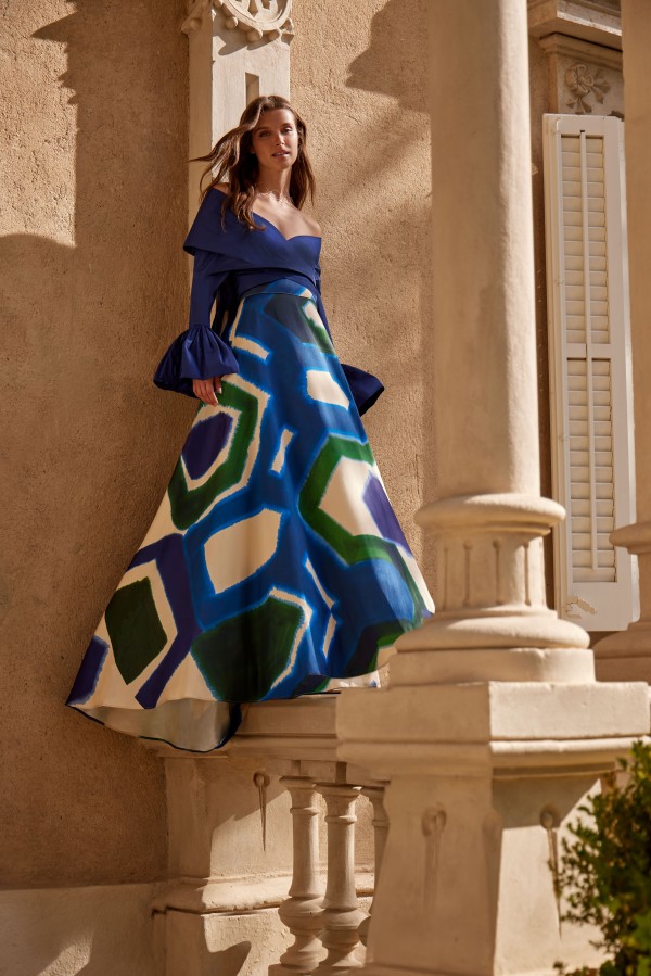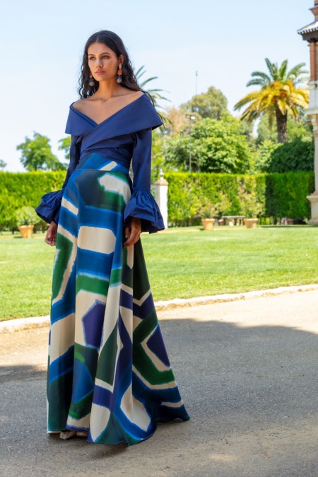 Gonna con taglio svasato e vestibilità fluida, la stampa astratta in toni blu, verdi e naturali,