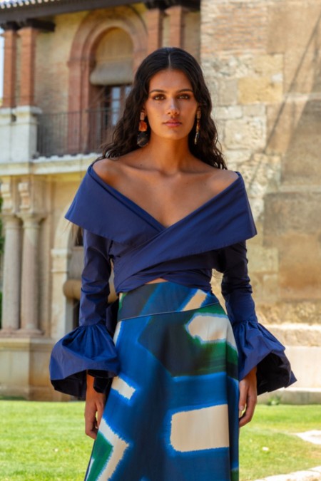 Blusa nel Colore blu Navy, Scollo Bardot che esalta le spalle e aggiunge un tocco unico, incrociata sul davanti e maniche lunghe scampanate