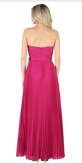 Abito lungo in chiffon col fucsia, corpetto drappeggiuato con scollo a cuore, gonna plissettata.