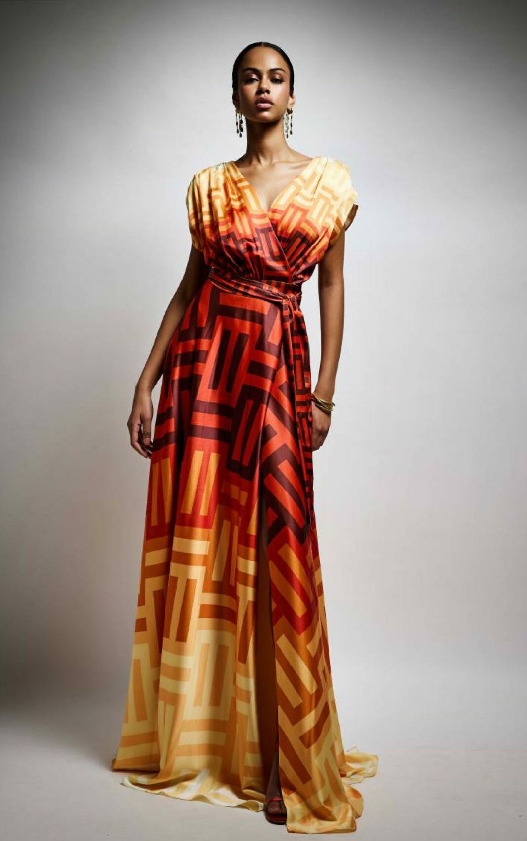 Abito lungo in raso fantasia, incrociato sul seno e spalla scesa, fusciacca in vita.