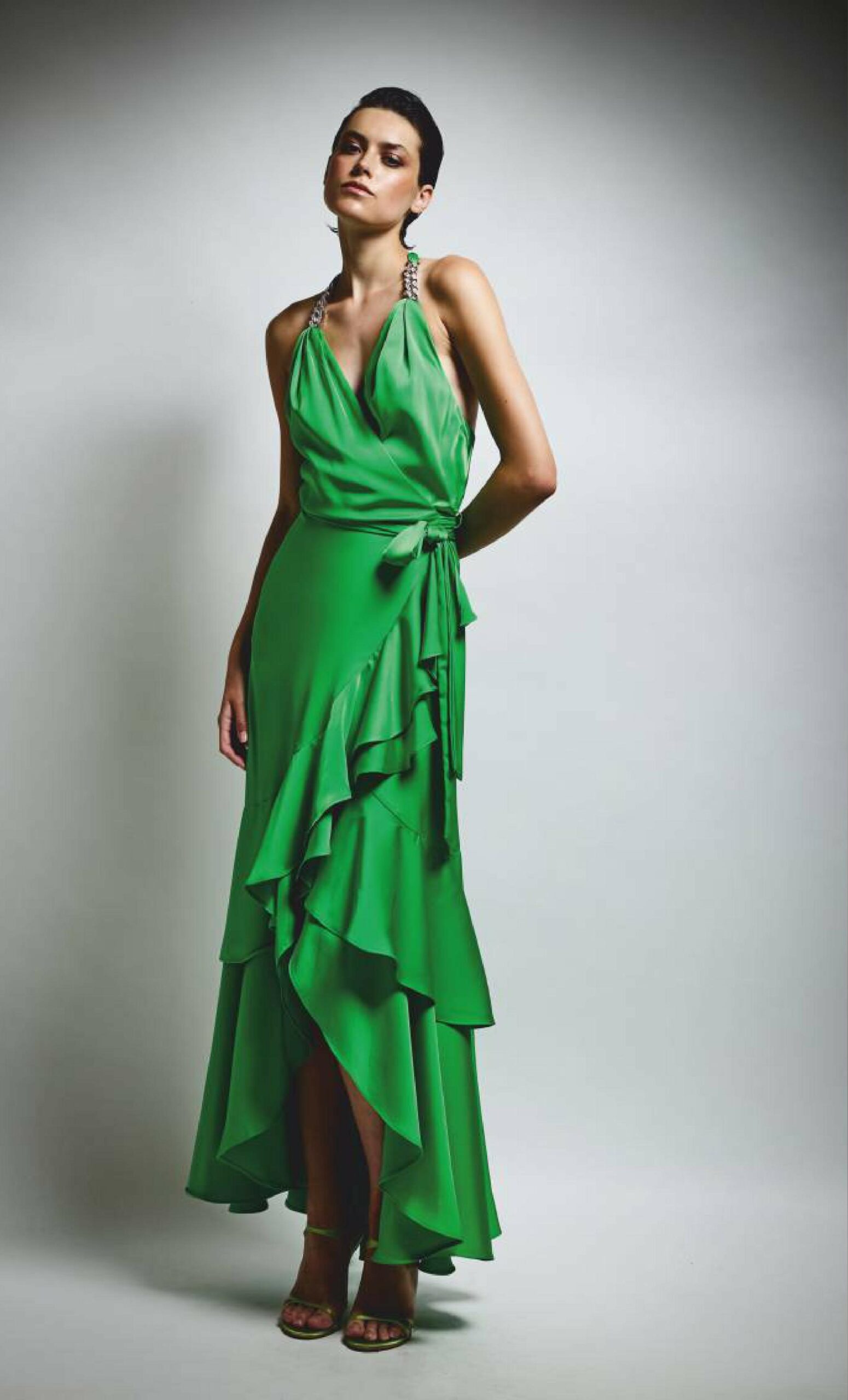 Chiusura a portafoglio con ampia rouches asimmetrica piu’ balze.