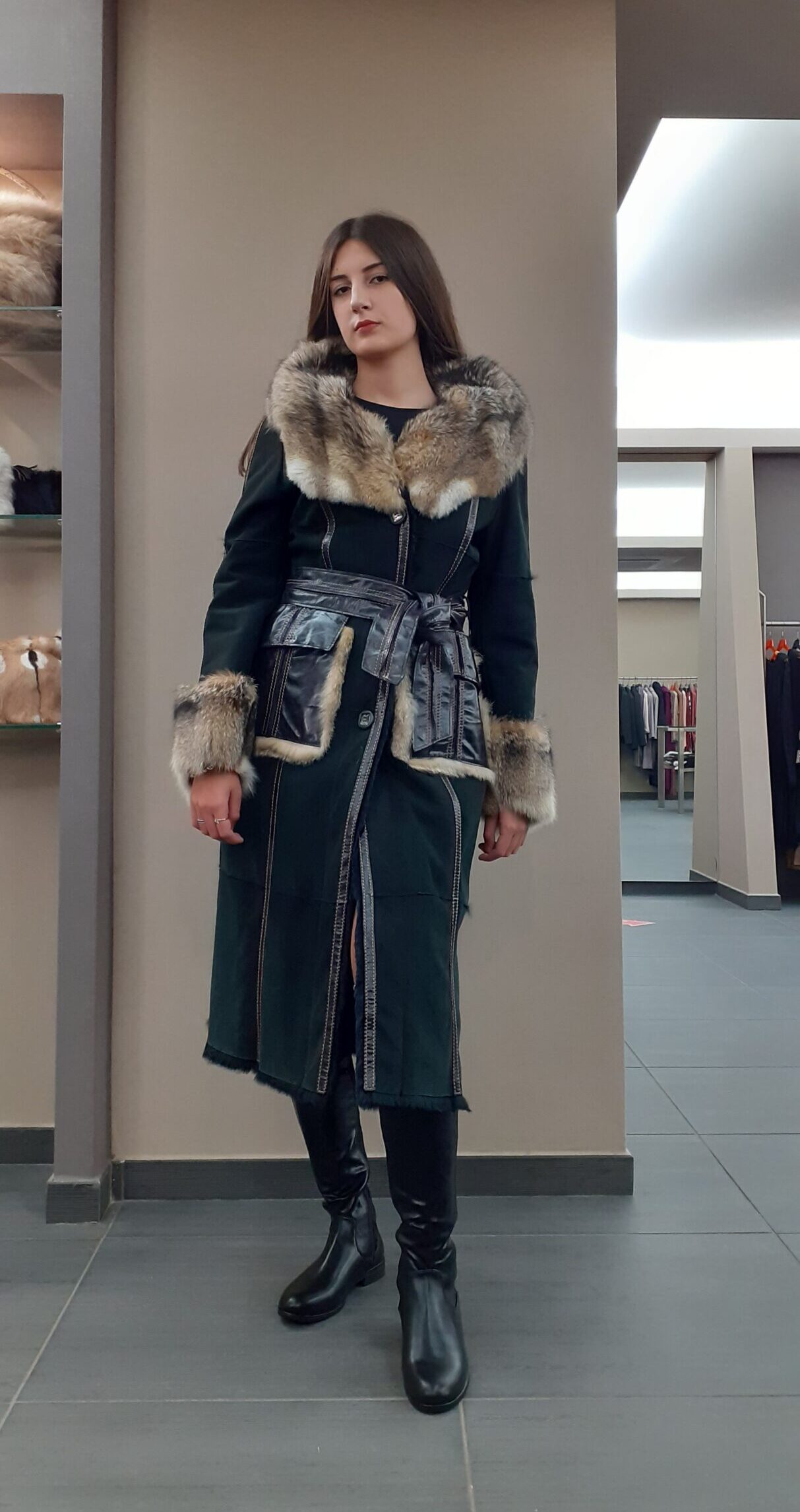 Cappotto in Lapin scamosciato con collo e polsi in volpe della Patagonia , Tasconi sovrapposti in nappa con bordi in volpe . Cintura in nappa.