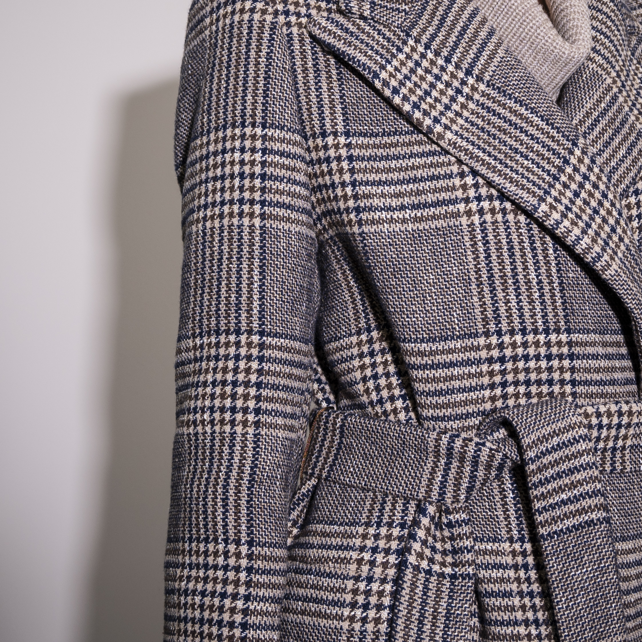 Cappotto petto e bavero con cintura, senza abbottonatura, manica a giro e tasche con patte.