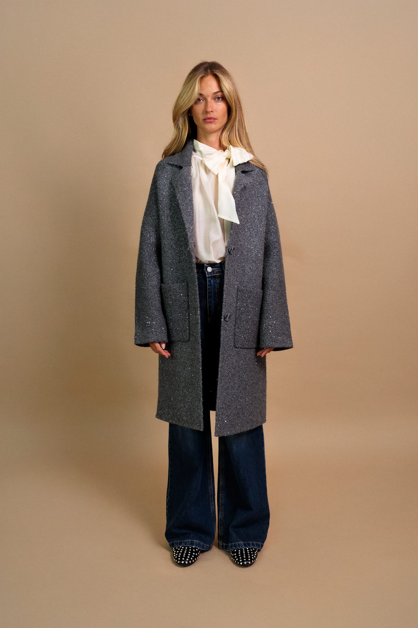 Cappotto paillettes in tessuto in maglia, colore grigio argento