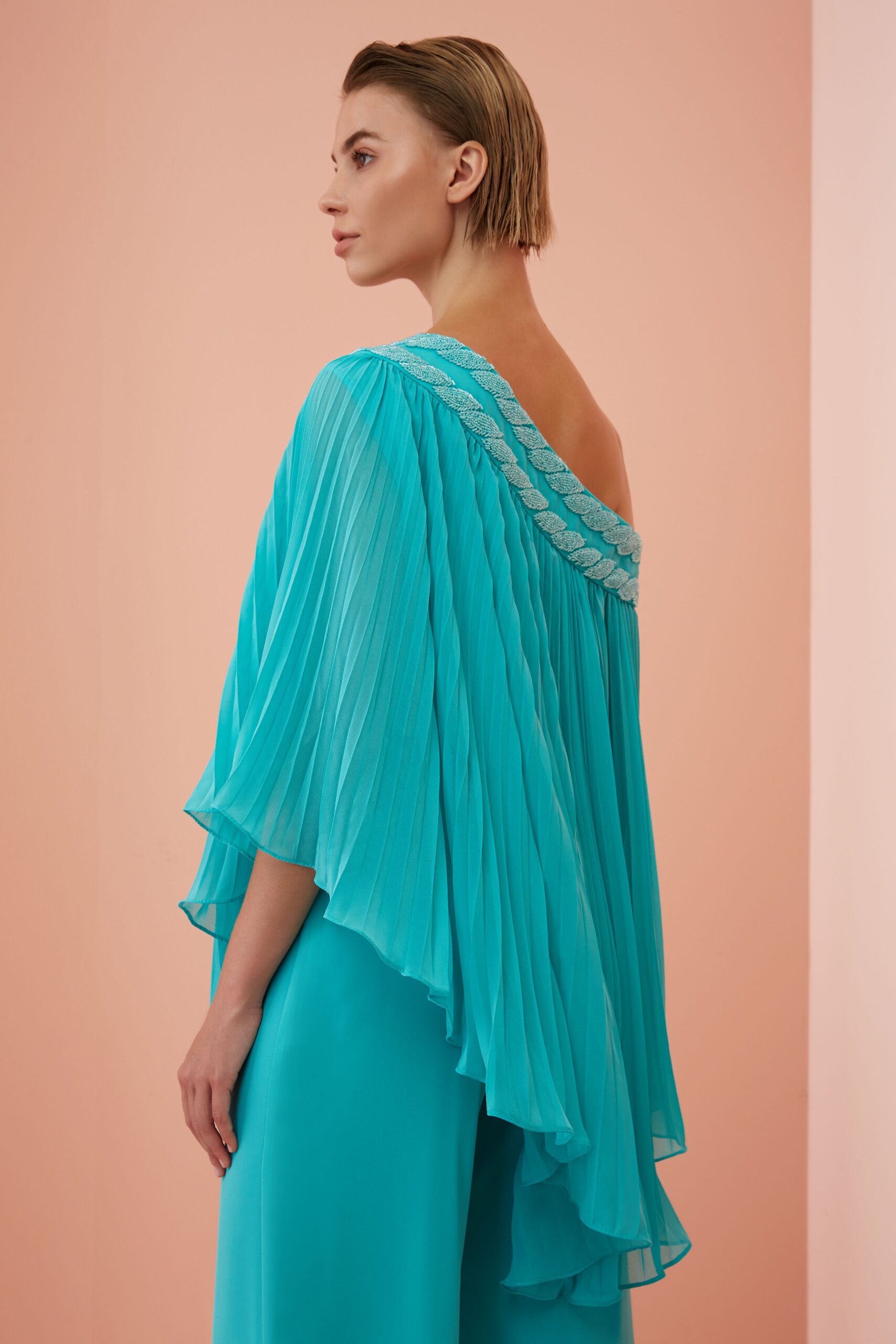 Completo composto da casacca plissetata e asimettrica, monospalla con decoro prezioso sulla scollatura.