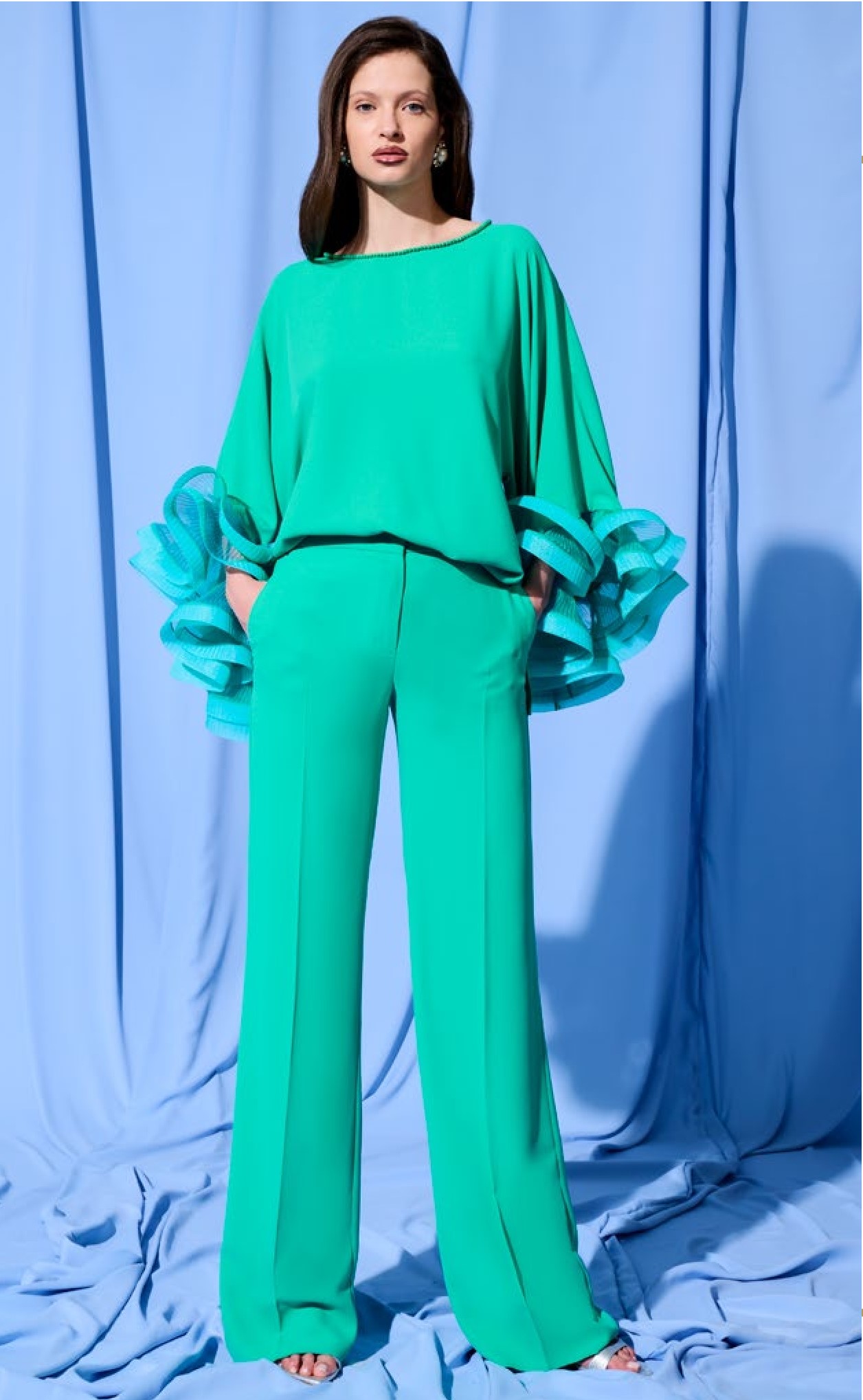 La blusa oversize dal collo tondo e maniche kimono a tre quarti si distingue per i volants trasparenti e leggeri in chiffon turchese, che creano un effetto vaporoso e dinamico, come onde di seta che danzano ad ogni movimento. I pantaloni fluidi e dritti, con la stessa nuance verde intenso, sfoggiano una vestibilità comoda e slanciata, ideale per esaltare la silhouette senza costrizioni. Il tessuto lucido e setoso, dona un finish lussuoso e facile da indossare