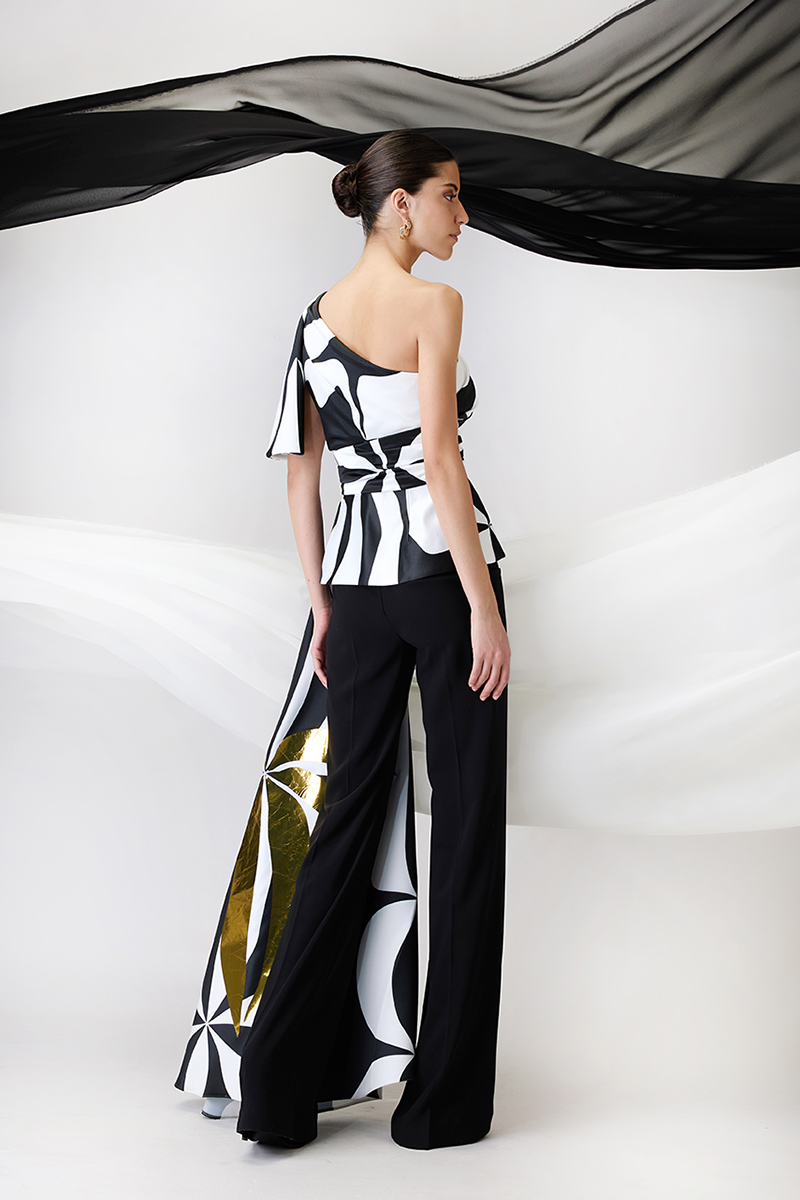 Completo top e pantalone. Top in raso bianco stampato nero e oro, con pannello lungo laterale.