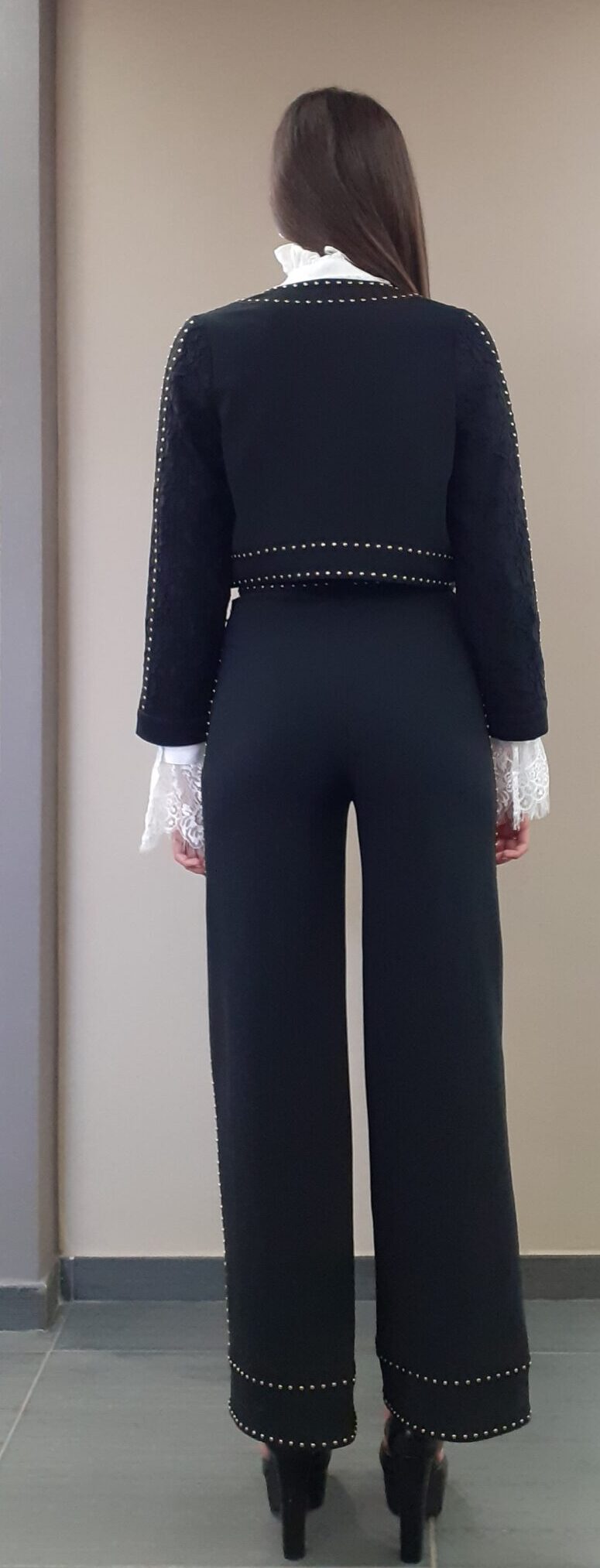 Giacca stile Chanel, in tessuto nero, ricoperto sul davanti interamente con pizzo. Rifiniture con borchie dorate intorno al collo, fondo giacca e maniche.