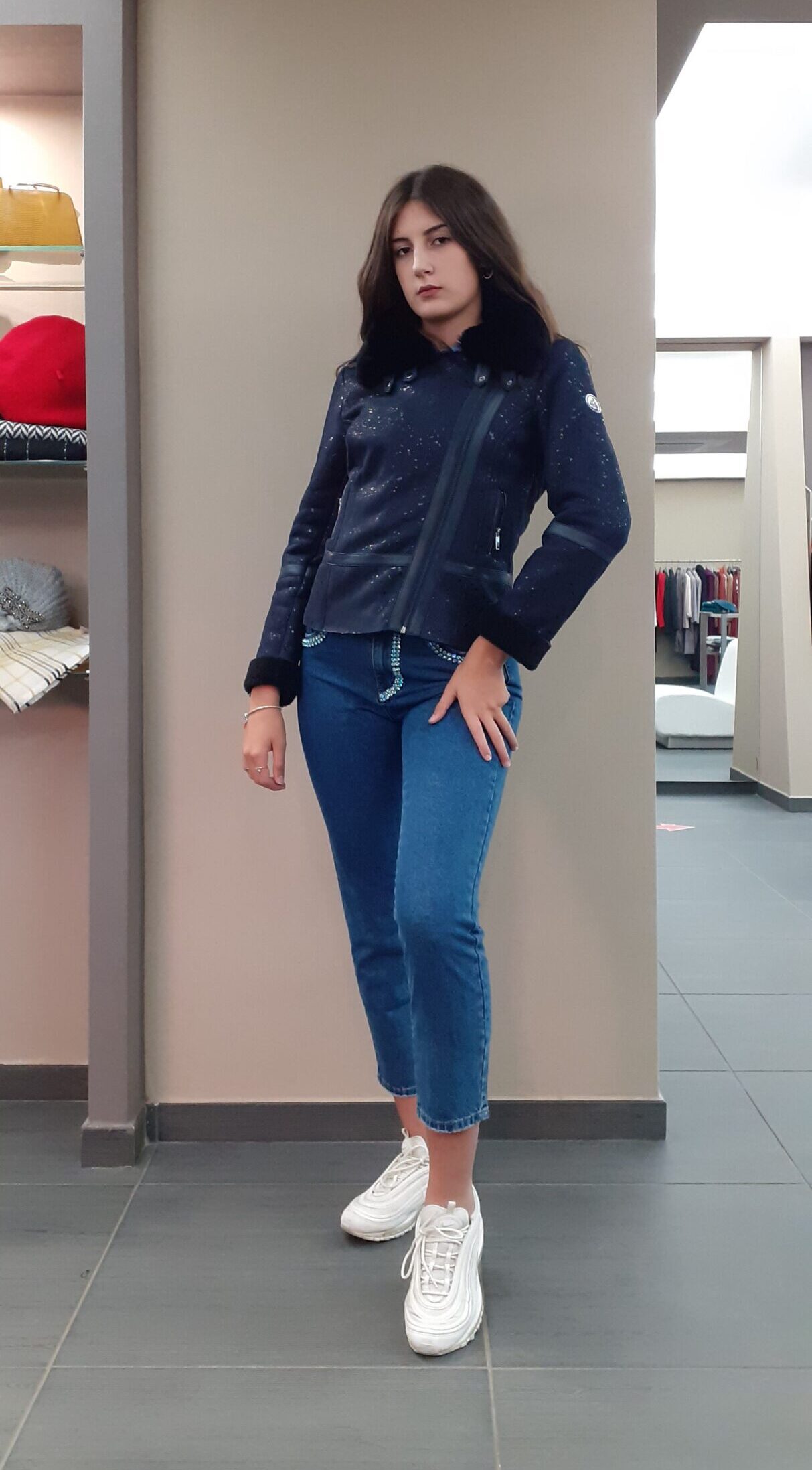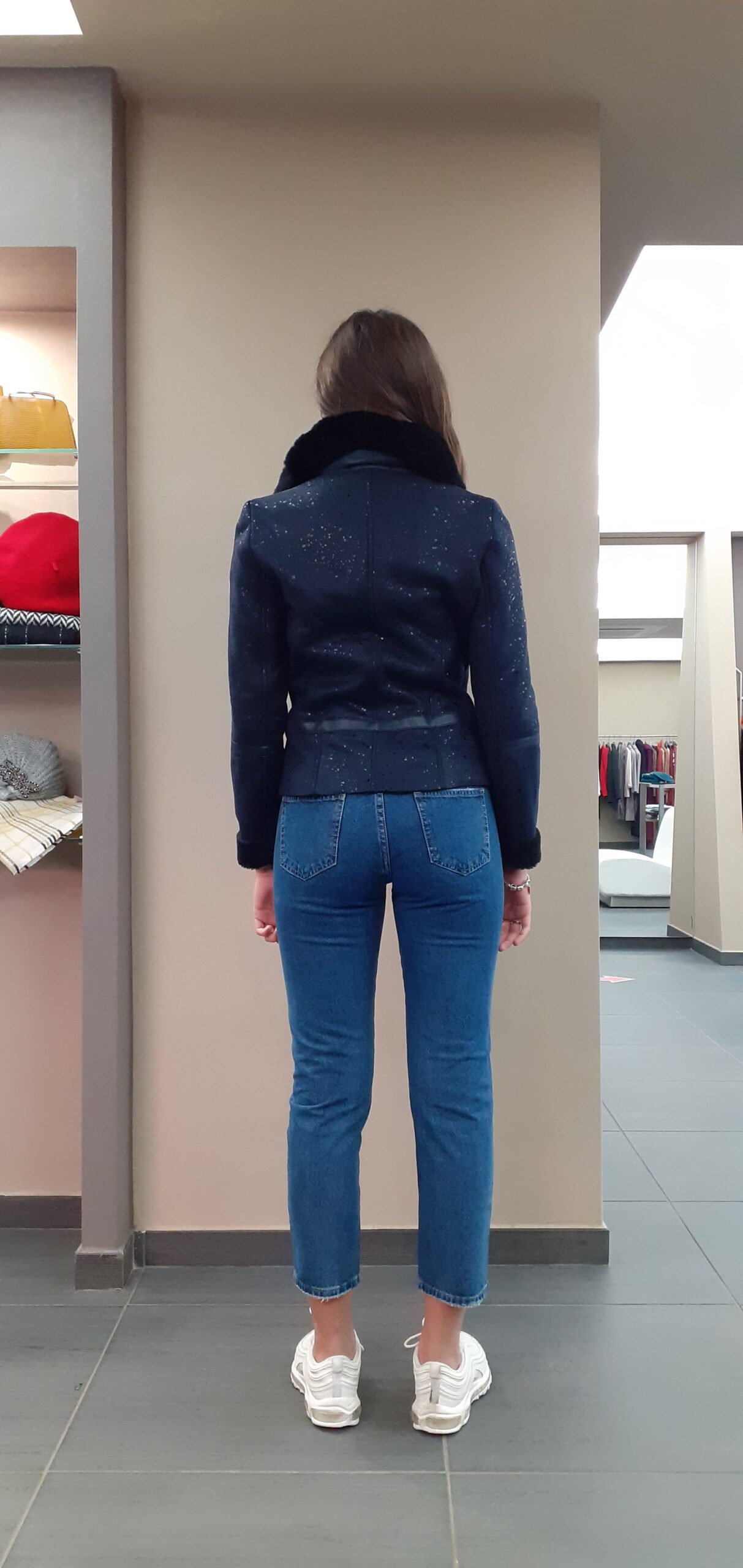 Giaccone in eco montone scamosciato blu,serigrafia sulla scamosciatura.Collo in eco pelliccia in tono, con 2 linguette per sormonto. Modello stile aviatore, zip avanti e tasche laterali in metallo. Bordi in eco pelle, ai lati delle zip, anche su maniche e punto vita.