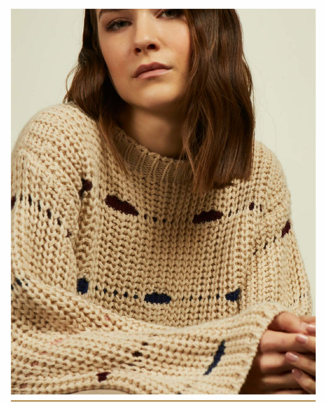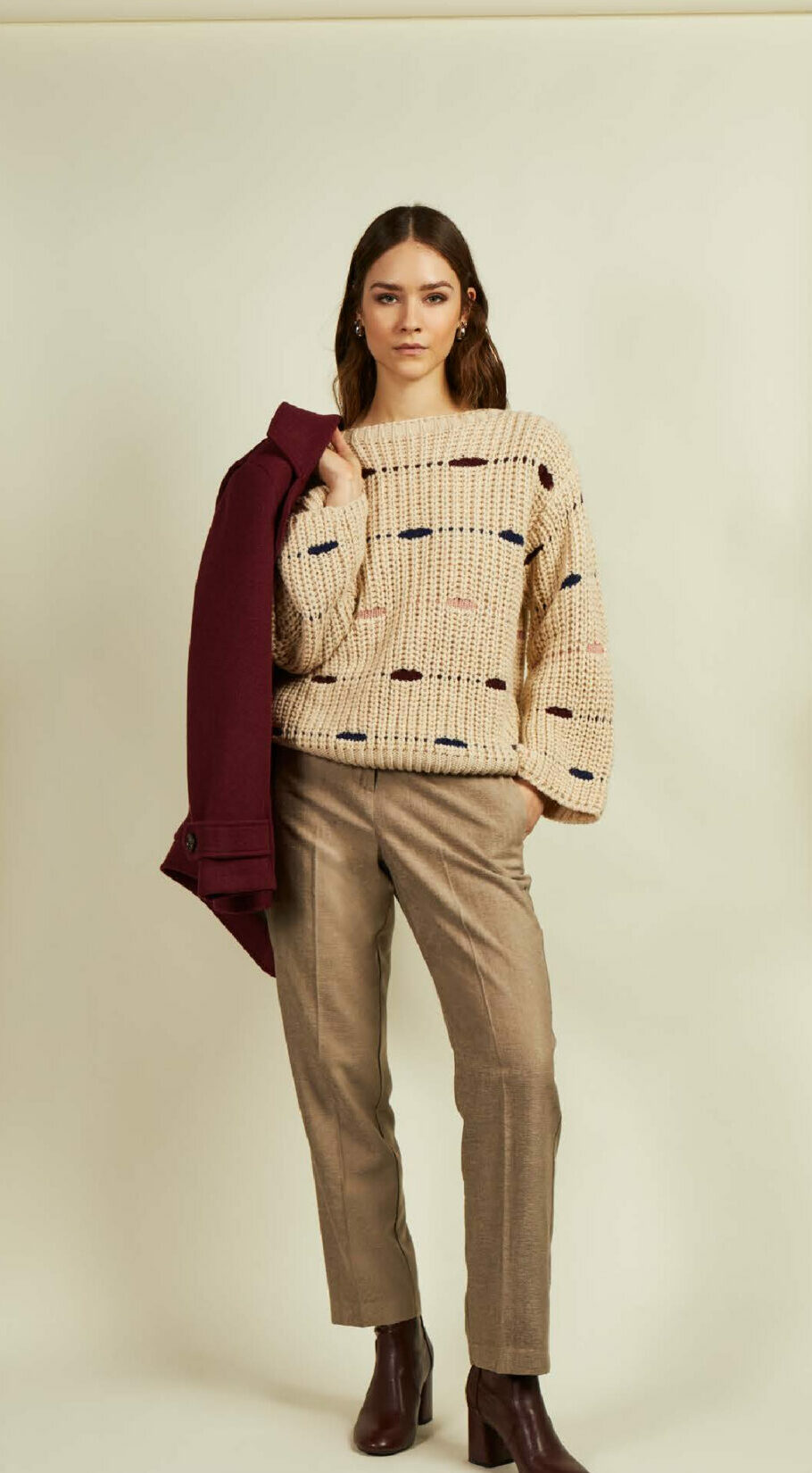 Maglia a costa larga, col. panna con motivi colorati, scollo a barca e manica larga sul fondo