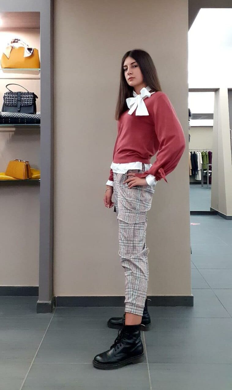 Maglia scollo a V, col. terracotta. Manica a giro con calatura, svasatura e spacco sul fondo, da poter creare fiocco. Elastico sul fondo a righe strette. Filato mano morbida. Cuciture interne punto maglia.