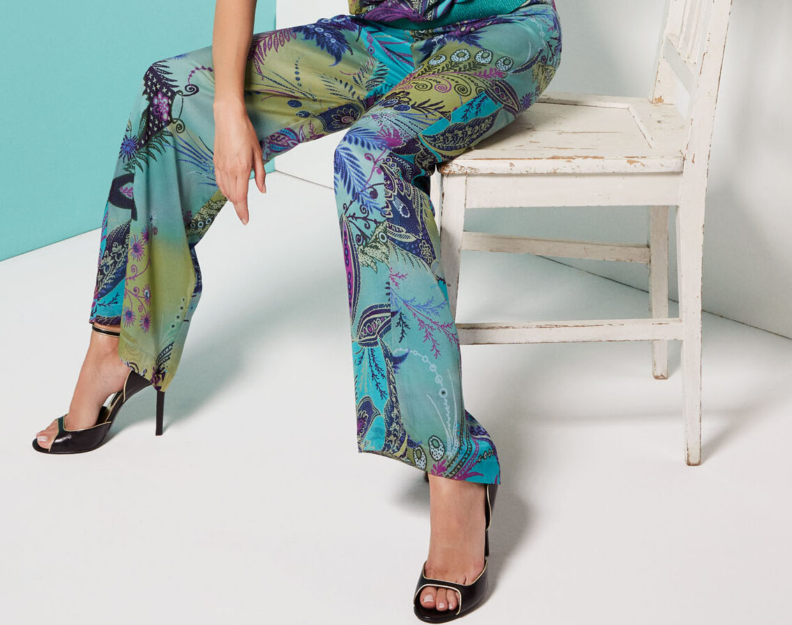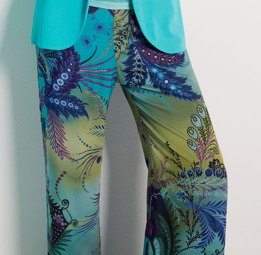 Pantalone raso garden fantasy, elastico in vita, gamba larga. 100% viscosa, tessuto fresco e leggero.