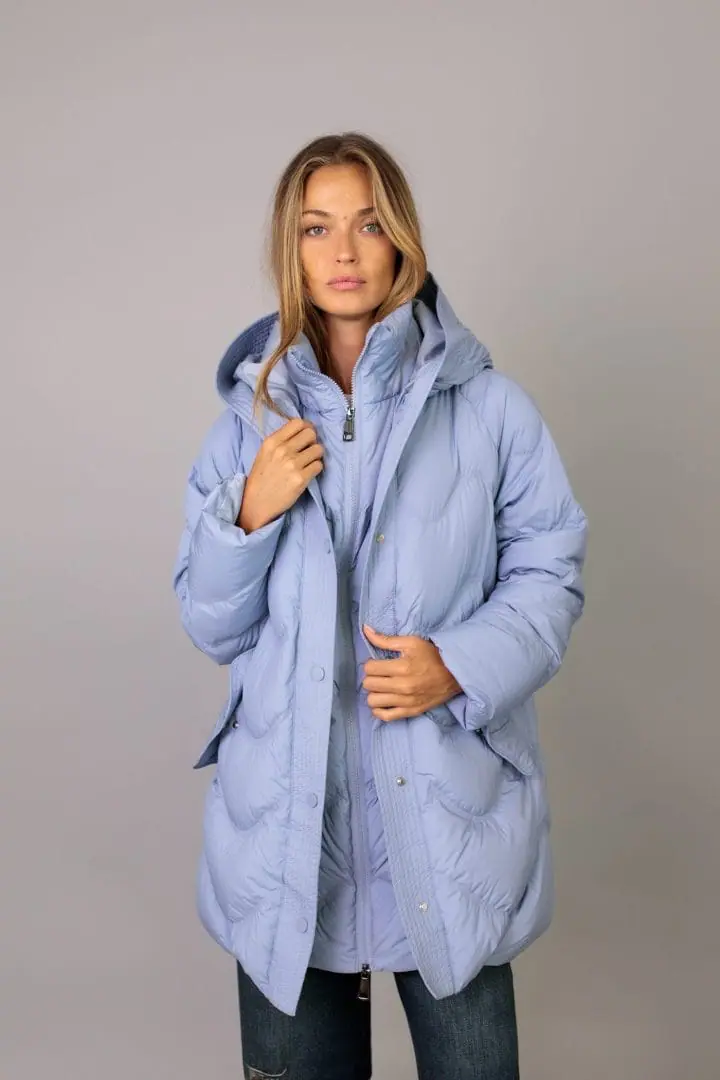 Piumino d’oca con cappuccio, fintone interno con collo pistagna, col. cielo
