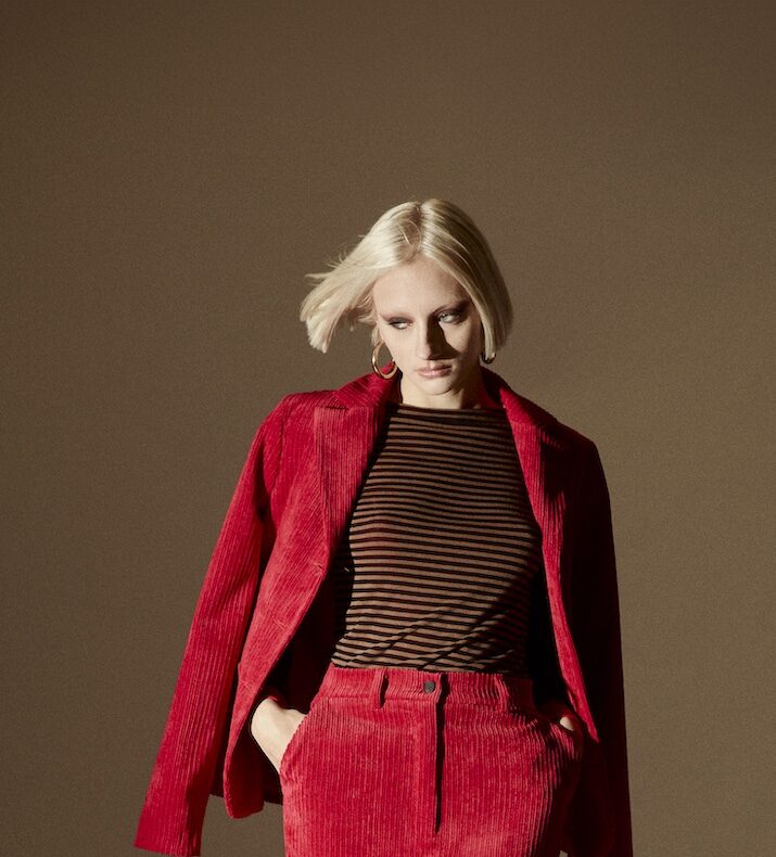 Maglia-sottogiacca scollo a barchetta, double, un lato a righe sui toni del nero e cioccolato l’altro lato in rosso, vestibilità aderente e confortevole sulla pelle.