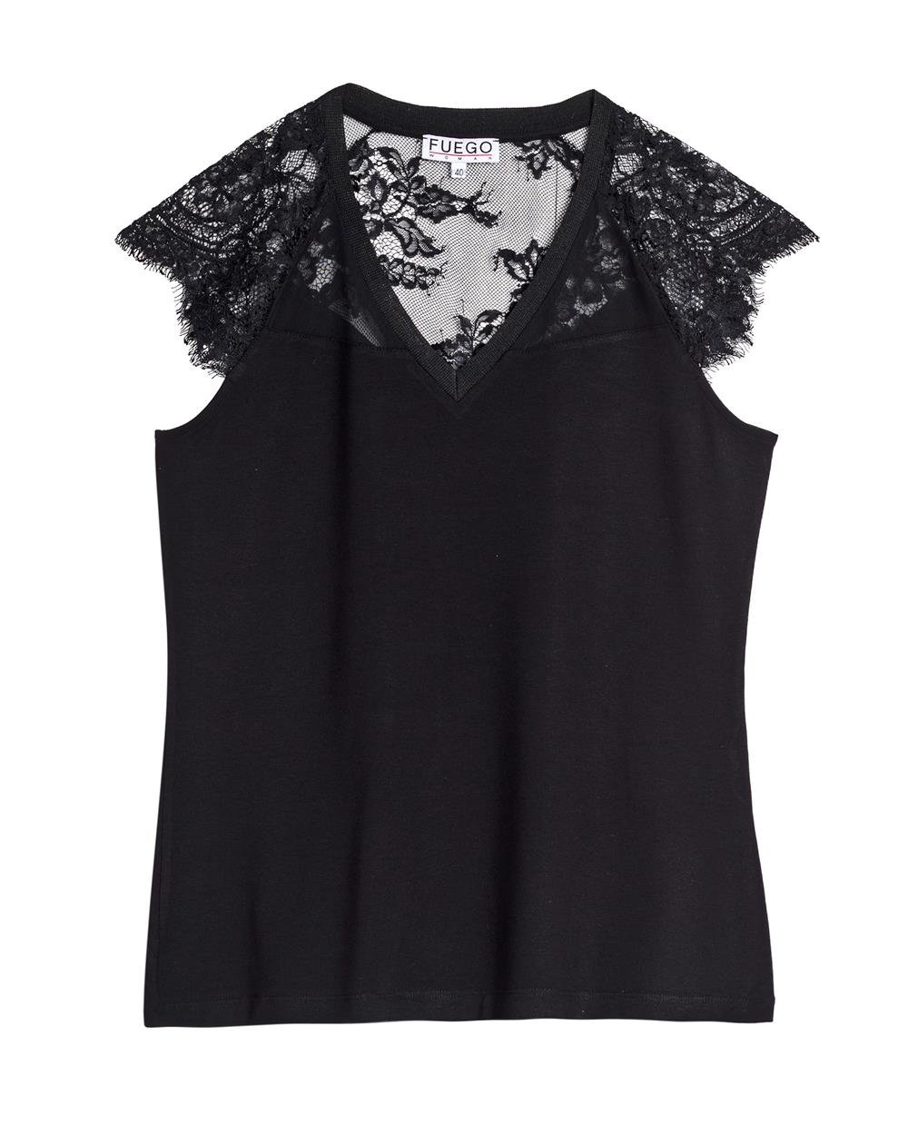 T-shirt nera, mezza manica accennata e spallone in pizzo, scollo a V.