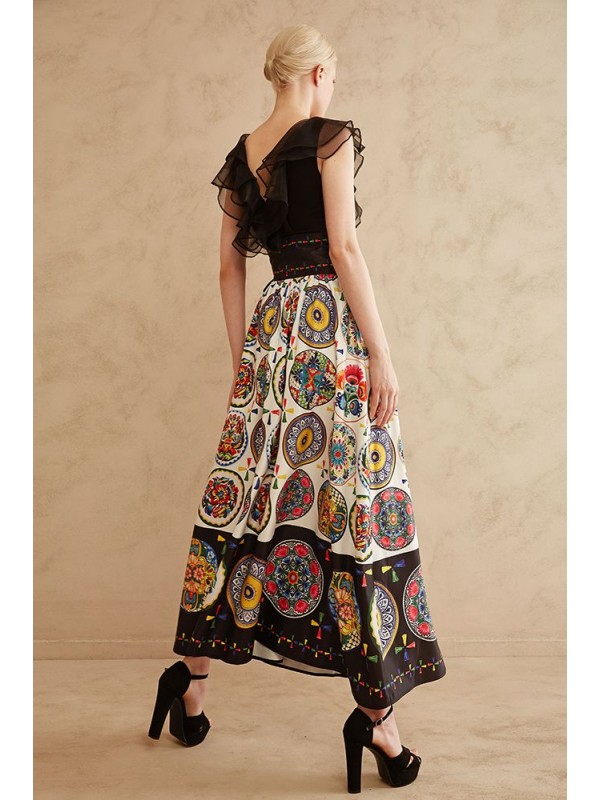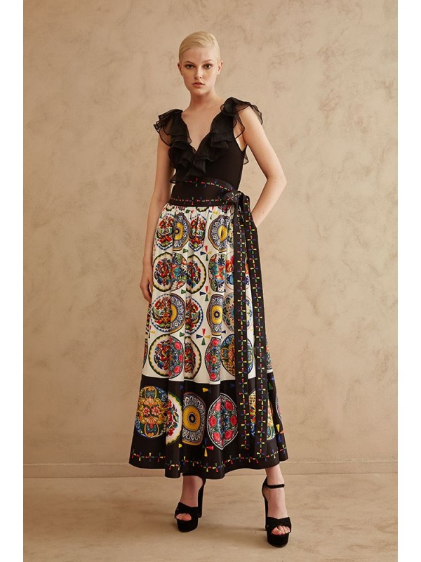 Gonnellone midi, in tessuto fantasia con fusciacca in vita.