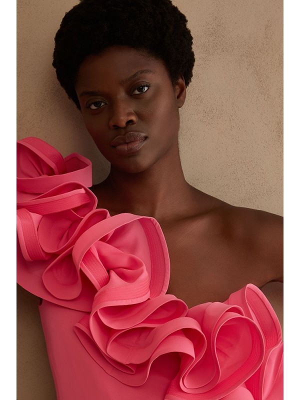 Top col. rosa monospalla, in tessuto elasticizzatto, con rouches sullo scollo.