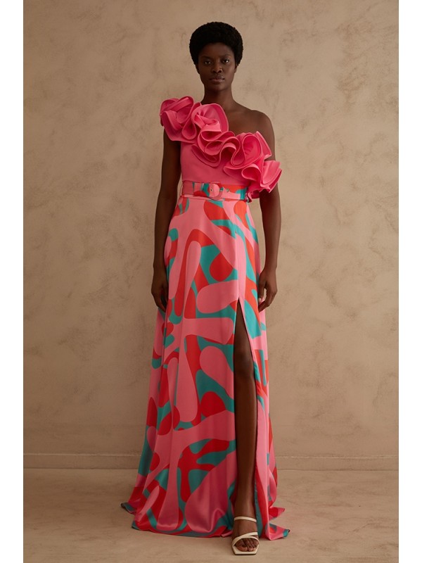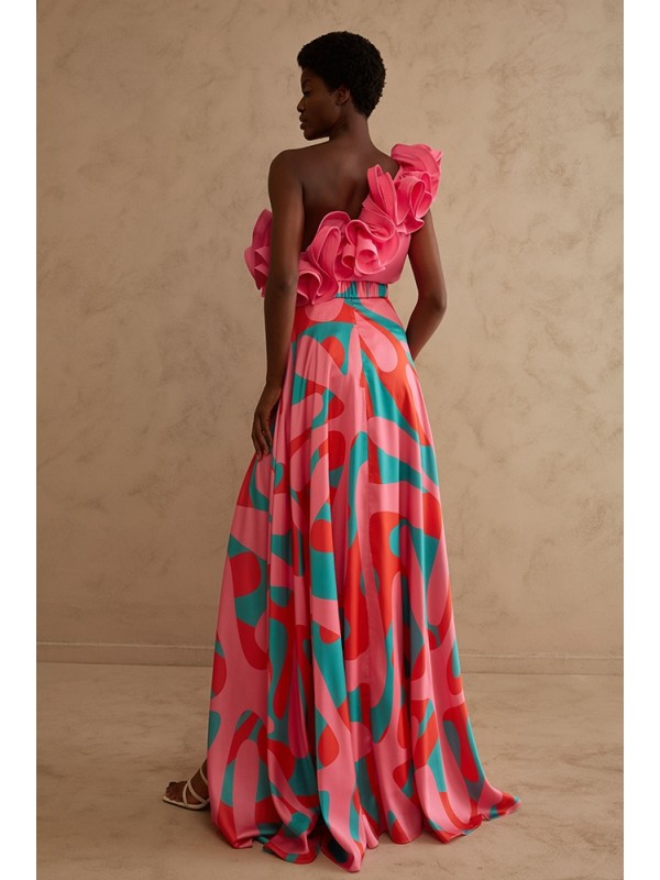 Gonnellone in raso stampato, linea svasata, spacco importante sulla gamba, cintura in vita.