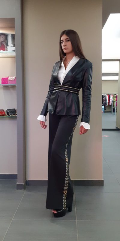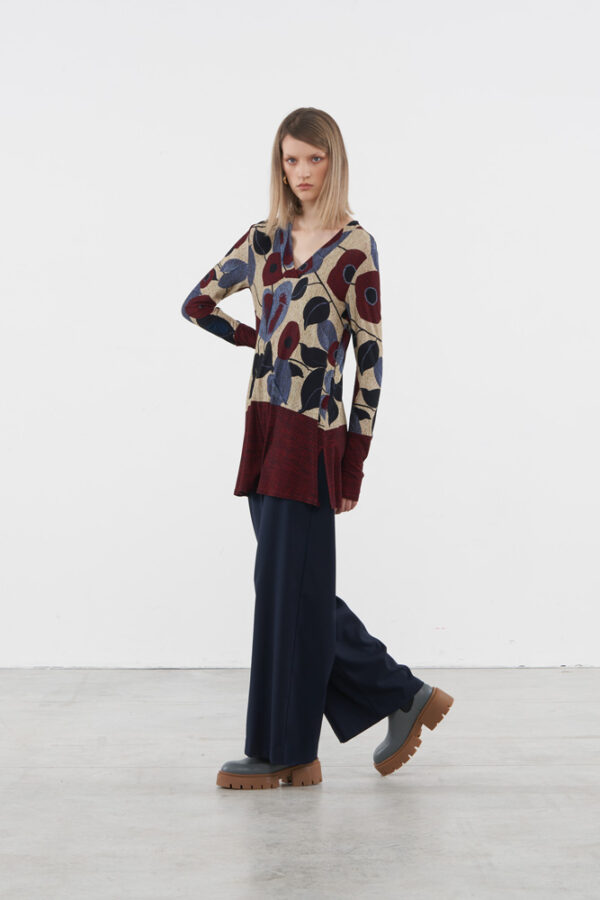 La tunica proposta in questo outfit riporta ad un mood rilassato dall’aspetto contemporary. Sviluppata interamente in viscosa stretch presenta spacchi laterali e un profondo scollo a V.