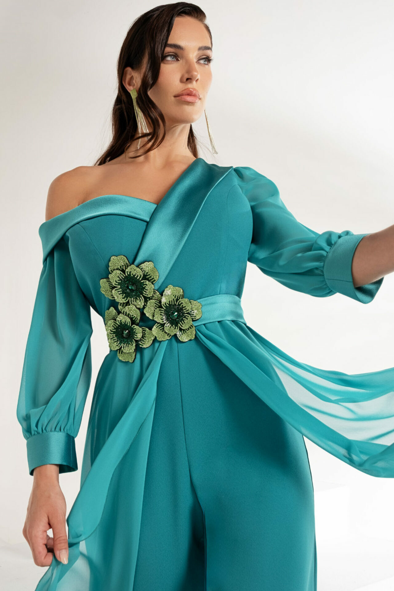 Tuta palazzo con manica lunga, realizzata in cady. Applicazioni con strass sul punto vita